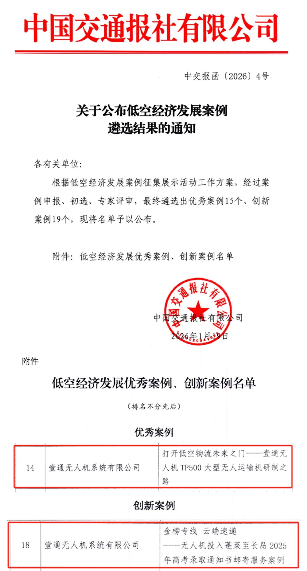 捷报传来,载誉前行!近日,由中国交通报社主办的低空经济发展案例征集展示活动落下帷幕,壹通无人机系统有限公司(以下简称“壹通无人机公司”)案例历经申报、初选、专家评审三重环节,最终两项案例分别入选低空经济发展优秀案例、创新案例双名单!