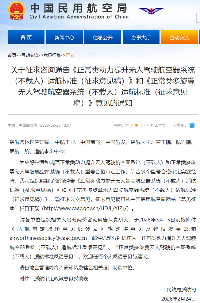 完整全文请点击下方链接 http://www.caac.gov.cn/HDJL/YJZJ/202602/t20260225_230112.html